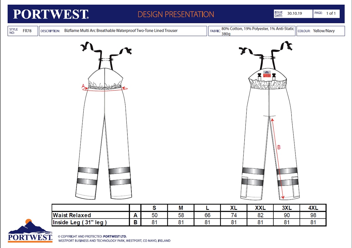 VÍCENÁSOBNÁ OCHRANA PROTI NEBEZPEČÍ Do kombinace s FR61 Tyto multi-norm laclové kalhoty jsou vyrobeny ze stejného materiálu jako FR60. Tento pohodlný oděv poskytuje ochranu proti více rizikům. Hi-Vis pruhy na nohou a pasu, dvě přední kapsy, náprsní kapsa s patkou, zadní kapsa s patkou a menší kapsa na nářadí s patkou, dvojité prošití Materiál: Bizflame™ Multi 345 g UPF 50+ Kapsa na metr Maloobchodní balení Kapsy na kolenní vložky HRC2 Nehořlavá páska pro průmyslové praní CE certifikace Mosazný zip Zadní kapsy Nastavitelné popruhy Kombinované ATPV hodnocení 7 kapes NormyELIM TESTING IN PROGRESSEN 1149 -5EN 13034 Type PB [6]EN ISO 11612 A1+A2, B1, C1, E3, F1EN ISO 11611 Class 1 A1+A2IEC 61482-2 IEC 61482-1-2 Class 1EN ISO 20471 Class 2ASTM F1959/F1959M-12 ATPV=13.6 Cal/CM2 (HAF=82%) BIZFLAME MULTI - vysoce inovativní nehořlavá tkanina a navís vysokou viditelností, 99% bavlna, 1% uhlíkové vlákno, antistatické vlastnosti, ochrana před plamenem, elektrickým obloukem.