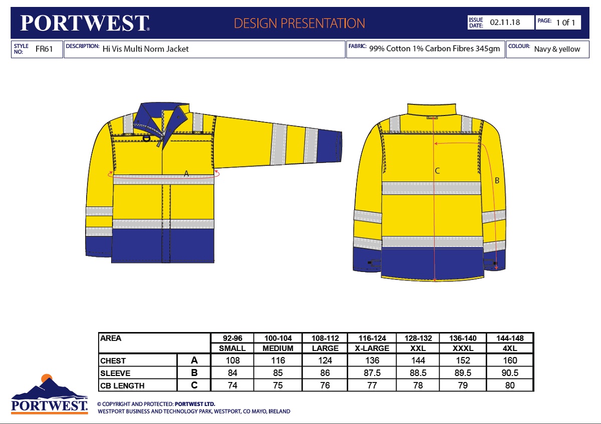 VÍCENÁSOBNÁ OCHRANA PROTI NEBEZPEČÍ Tato FR60 kombinéza je vyrobena s reflexními pruhy pro větší viditelnost, nehořlavá, s plnou příslušnou certifikací. Tento pohodlný oděv poskytuje ochranu proti více rizikům, včetně vystavení teplu, ohni, chemikáliím, elektrickému oblouku a svařování. Dvojité prošití, Hi-Vis pruhy na hrudníku, horních a dolních končetinách, krytý mosazný dvoucestný zip, dvě kryté přední kapsy na hrudi, kryté boční kapsy, zadní kapsy a kapsu na metr. Tento oděv má také patentované kapsy kolenní vložky Materiál: Bizflame™ Mult 345 g Nastavitelné manžety na háček a očko UPF 50+ Trojité švy Maloobchodní balení Smyčka na radiostanici Kapsa na mobilní telefon Kapsy na kolenní vložky HRC2 Nehořlavá páska pro průmyslové praní Pohodlná, prodyšná tkanina Náprsní kapsa CE certifikace Mosazný zip Kombinované ATPV hodnocení 9 kapes Dvoucestný zip NormyELIM TESTING IN PROGRESSEN 1149 -5EN 13034 Type 6EN ISO 11612 A1+A2, B1, C1, E3, F1EN ISO 11611 Class 1 A1+A2IEC 61482-2 IEC 61482-1-2 Class 1EN ISO 20471 Class 3ASTM F1959/F1959M-12 ATPV=13.6 Cal/CM2 (HAF=82%) BIZFLAME MULTI - vysoce inovativní nehořlavá tkanina a navís vysokou viditelností, 99% bavlna, 1% uhlíkové vlákno, antistatické vlastnosti, ochrana před plamenem, elektrickým obloukem.