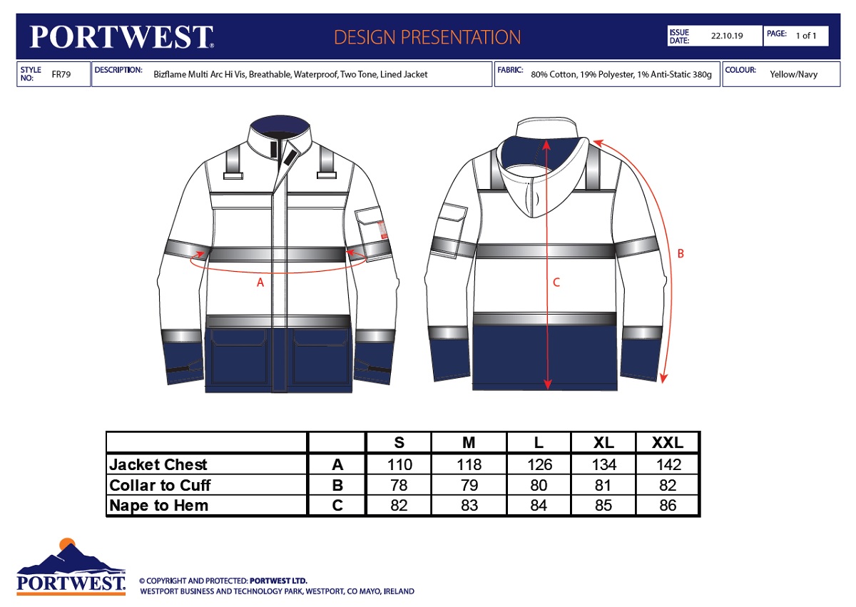 VYROBENO Z PŘIROZENĚ OHNIVZDORNÉHO MATERIÁLU pohodlné kalhoty poskytují optimální ochranu ve více rizikových prostředích elastické šle umožňují maximální volnost pohybu během pracovního dne ideální v kombinaci s FR79 Parka vnější tkanina: Bizflame Multi Rain 380g vnitřní tkanina: 100% bavlněná nehořlavá podšívka 170g 1 / 12 Funkce CE v kategorii 3 nehořlavé ošetření nepromokavé tkaniny zabraňuje pronikání vody chrání proti sálavému a konvekčnímu teplu certifikovaná ochrana proti postřiku roztaveným kovem antistatické nehořlavá páska pro průmyslové praní průdušná tkanina odvádí z těla vlhkost a zabezpečuje tak nositeli svěžest, pocit sucha a pohodlí podšívka z nehořlavé bavlny pro větší teplo a komfort zip u kotníků pro snadné nasazení na pracovní obuv lepené švy pro další ochranu Normy ELIM TESTING IN PROGRESS EN 1149 -5 EN ISO 11612 A1, A2, B1, C1, E2 EN ISO 11611 Class 2 A1+A2 IEC 61482-2 IEC 61482-1-2 Class 1 EN 13034 Type 6 EN ISO 20471 Class 2 EN 343 Class 3:3 Bizflame Multi Celkem splňuje 7 EN norem, 80% bavlna, 19% polyester, 1% uhlíková vlákna, gramáž 380g.Materiál kombinuje dlouhodobou ochranu s vynikajícím pohodlím a vzhledem.Mimořádné ochranné vlastnosti, které nabízejí jak Hi-Vis, tak bezpečnost a nehořlavé vlastnosti.